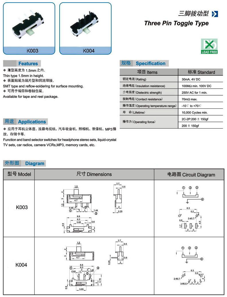 K003 K004(Three Pin Toggle Type)三腳撥動(dòng)型